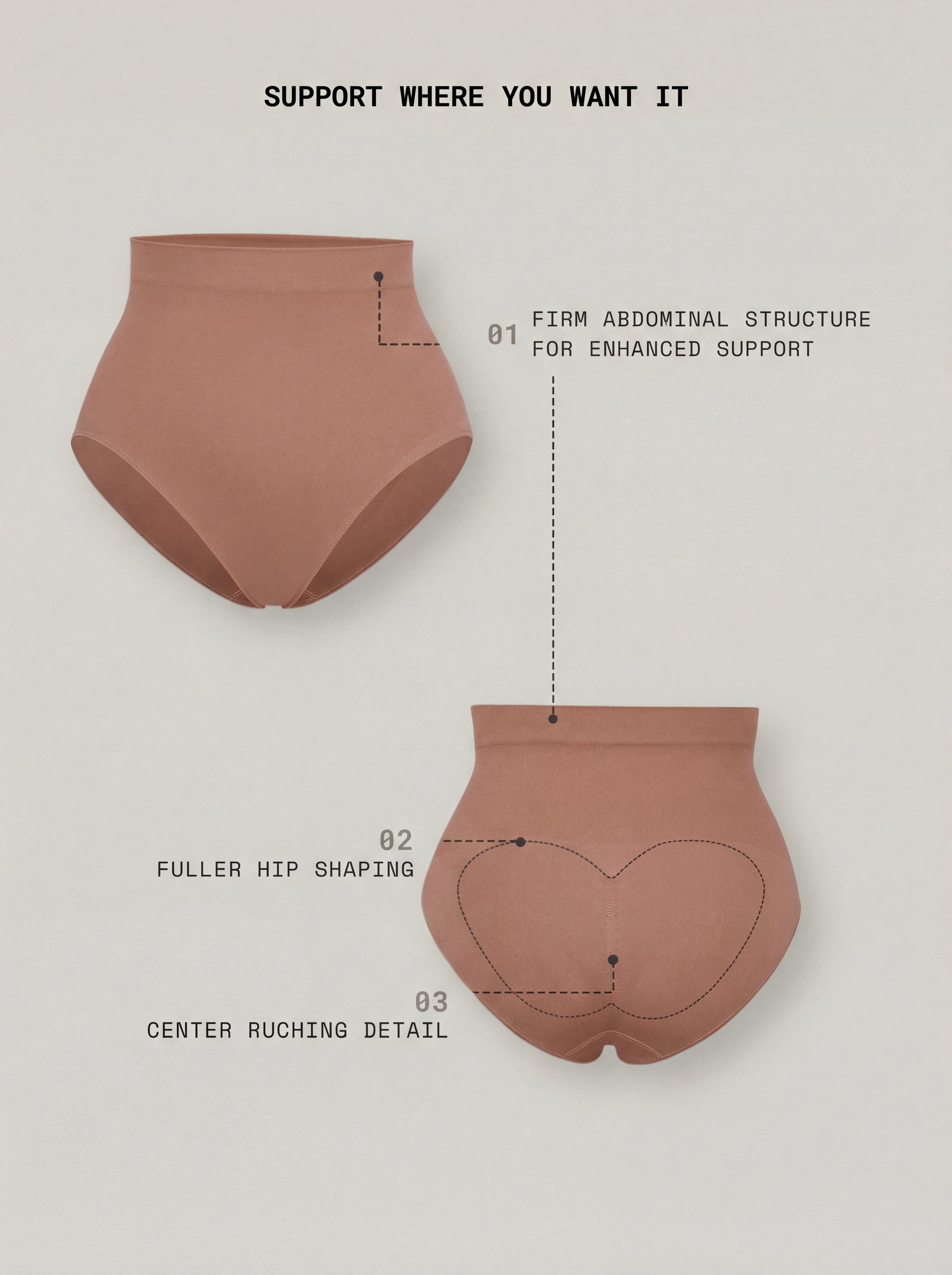 - High-waist tummy support provides gentle abdominal shaping without restriction