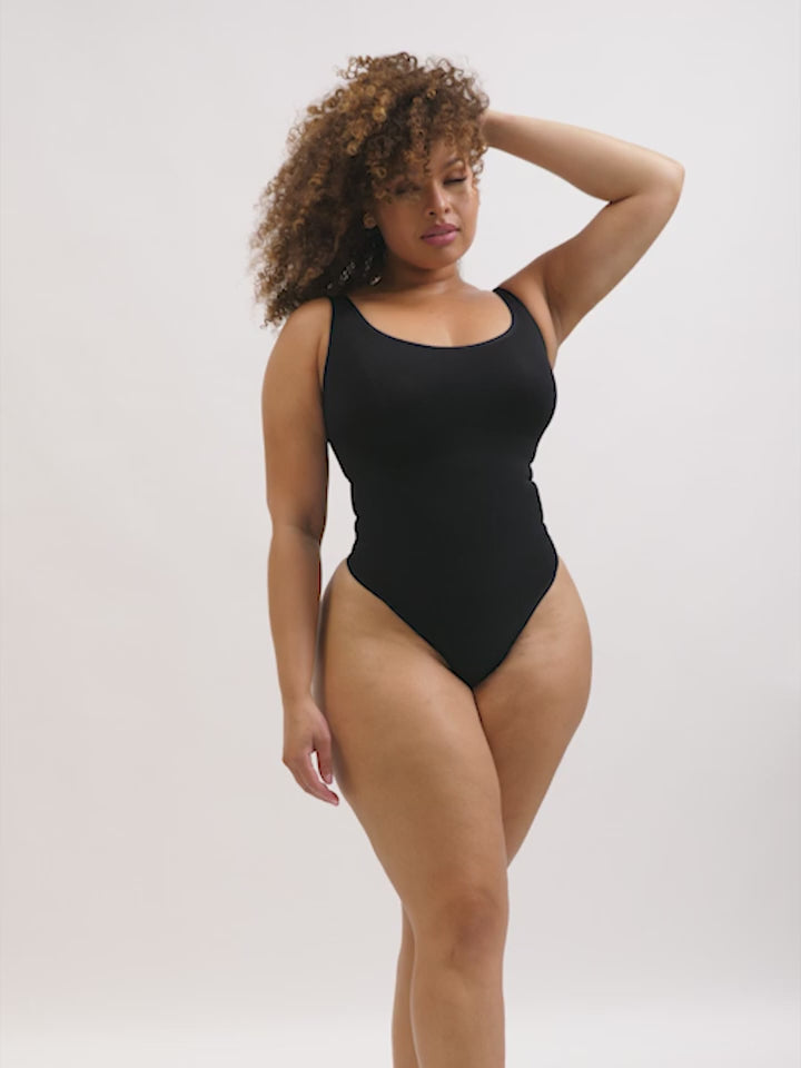 Smooth, sculpting, and consciously designed, EcoFit™ Bodysuit delivers confident shaping with eco-comfort you can feel all day. Crafted from recycled, high-elastic fabric, it gently controls the tummy while supporting the bust for a naturally contoured silhouette. The seamless finish hugs the body without irritation, while the thong cut stays invisible under clothing. Perfect for everyday wear or styled as outerwear with denim and layers.