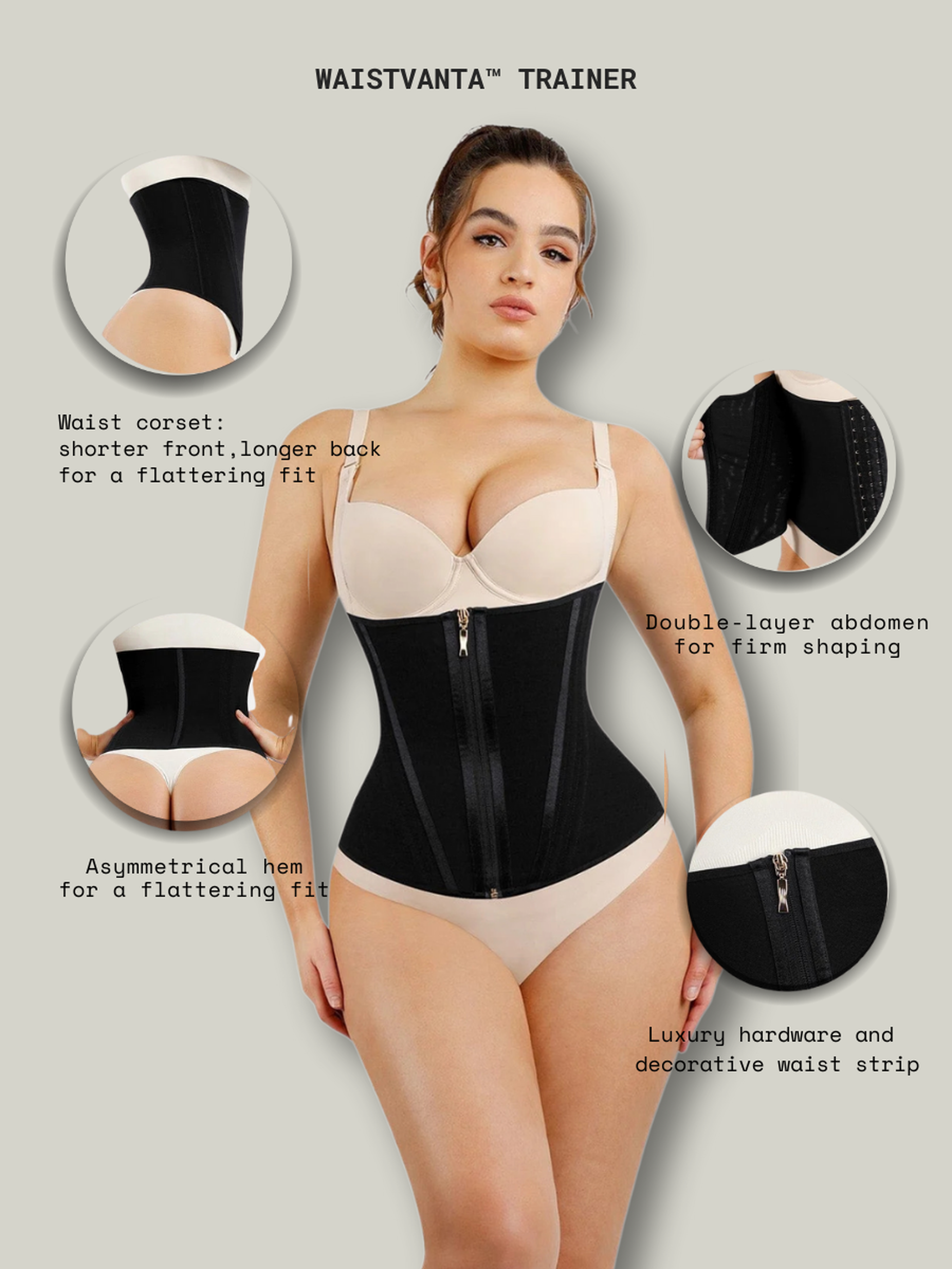Designed for powerful waist shaping with a luxe finish, WaistVanta™ Trainer delivers high-compression control to sculpt the waist and midsection with precision. Built with 15 steel bones and dual-layer abdominal compression, it enhances shaping while maintaining structured support and flexibility. A streamlined zipper-and-button closure ensures a smooth silhouette, while gold hardware and embossed detailing elevate its premium, fashion-forward look.