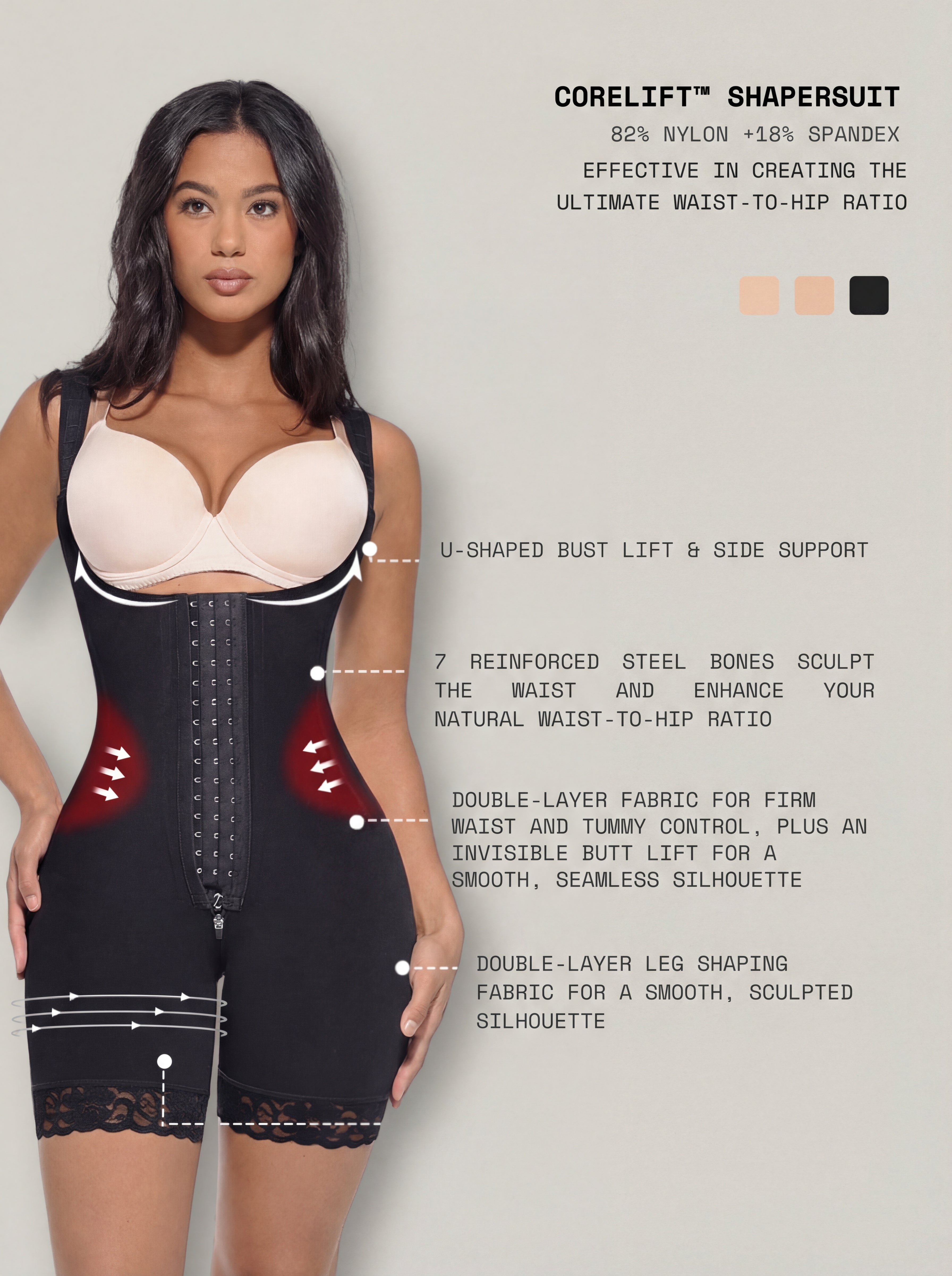 Designed for structured shaping and confident support, CoreLift™ ShaperSuit delivers powerful contouring from bust to thigh with a smooth, sculpted finish. Built with firm mesh, high-elastic fabric, and 7 integrated steel bones, it targets the waist, abdomen, and hips to enhance curves while maintaining comfort. A U-shaped chest support design, adjustable straps, and a fully opening front closure make it supportive, practical, and easy to wear for everyday shaping.