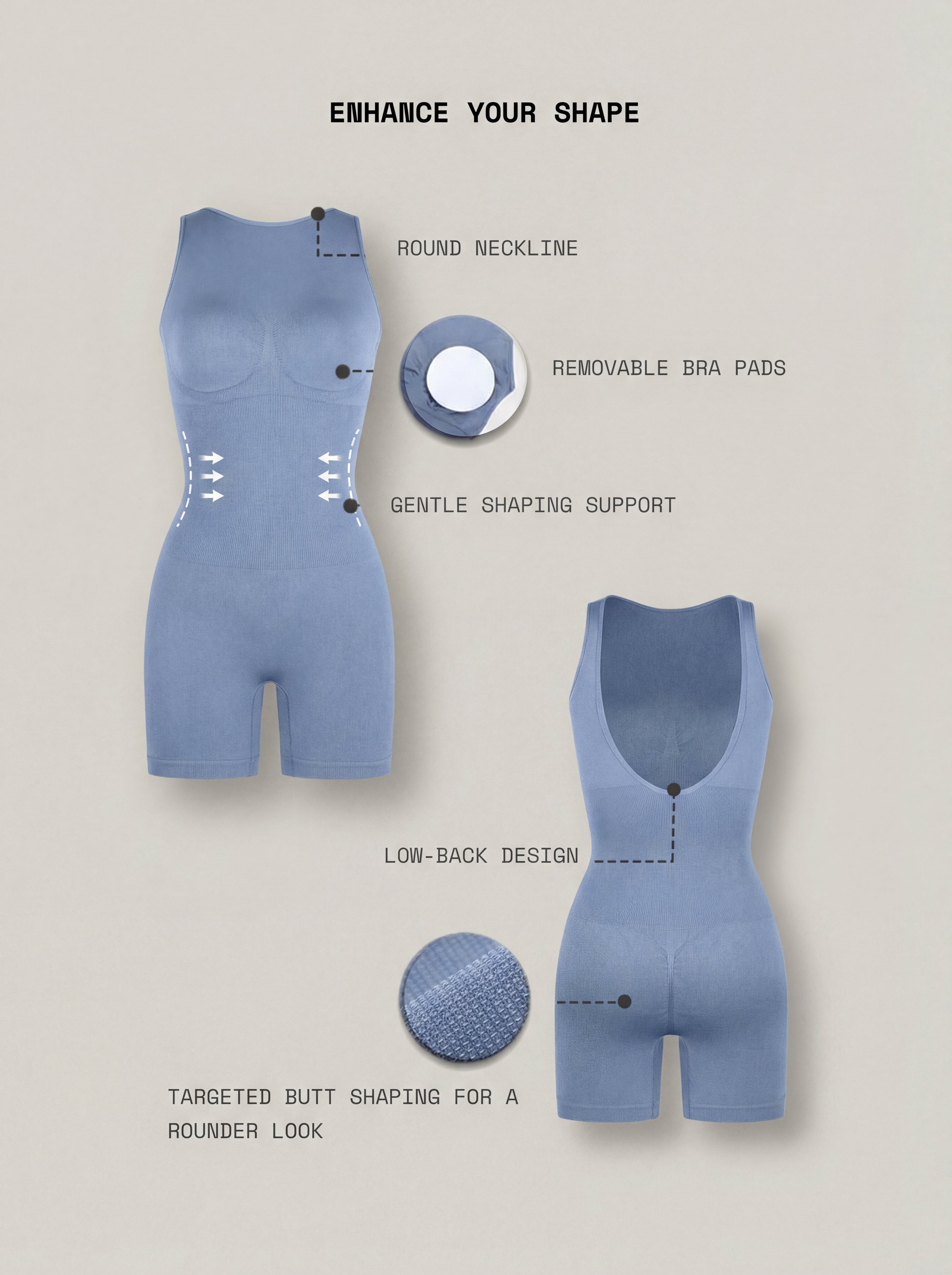 Sleek, sculpting, and impossibly smooth—CurveEase Bodysuit is your go-to one-and-done for a clean, contoured silhouette. Designed with seamless compression through the waist and lower abdomen, it refines your shape while staying soft and breathable against the skin. The built-in double-layer bust with removable cups gives gentle support and coverage—so you can skip the bra if you want. Finished with a daring U-back and booty-enhancing knit, it’s confidence from every angle.