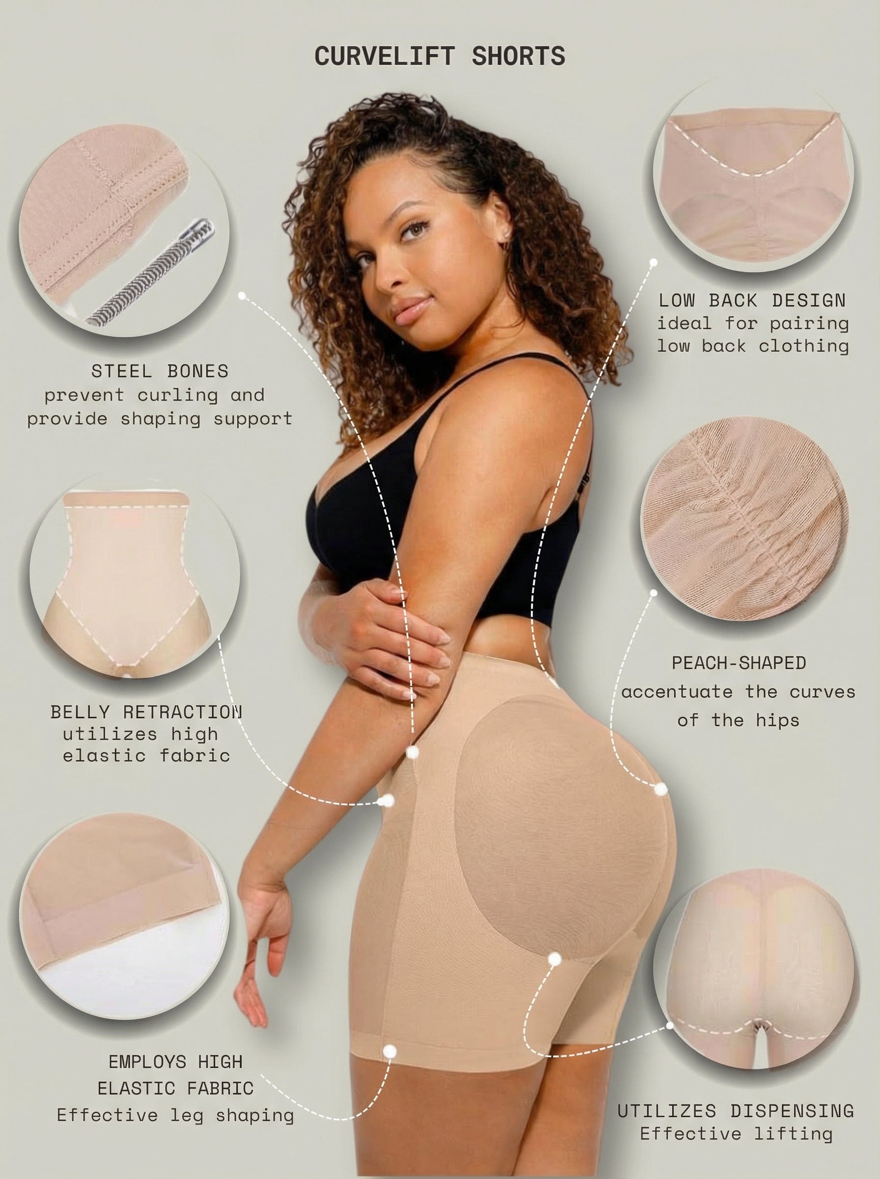 - Peach-shaped butt lift design enhances and lifts curves for a fuller look