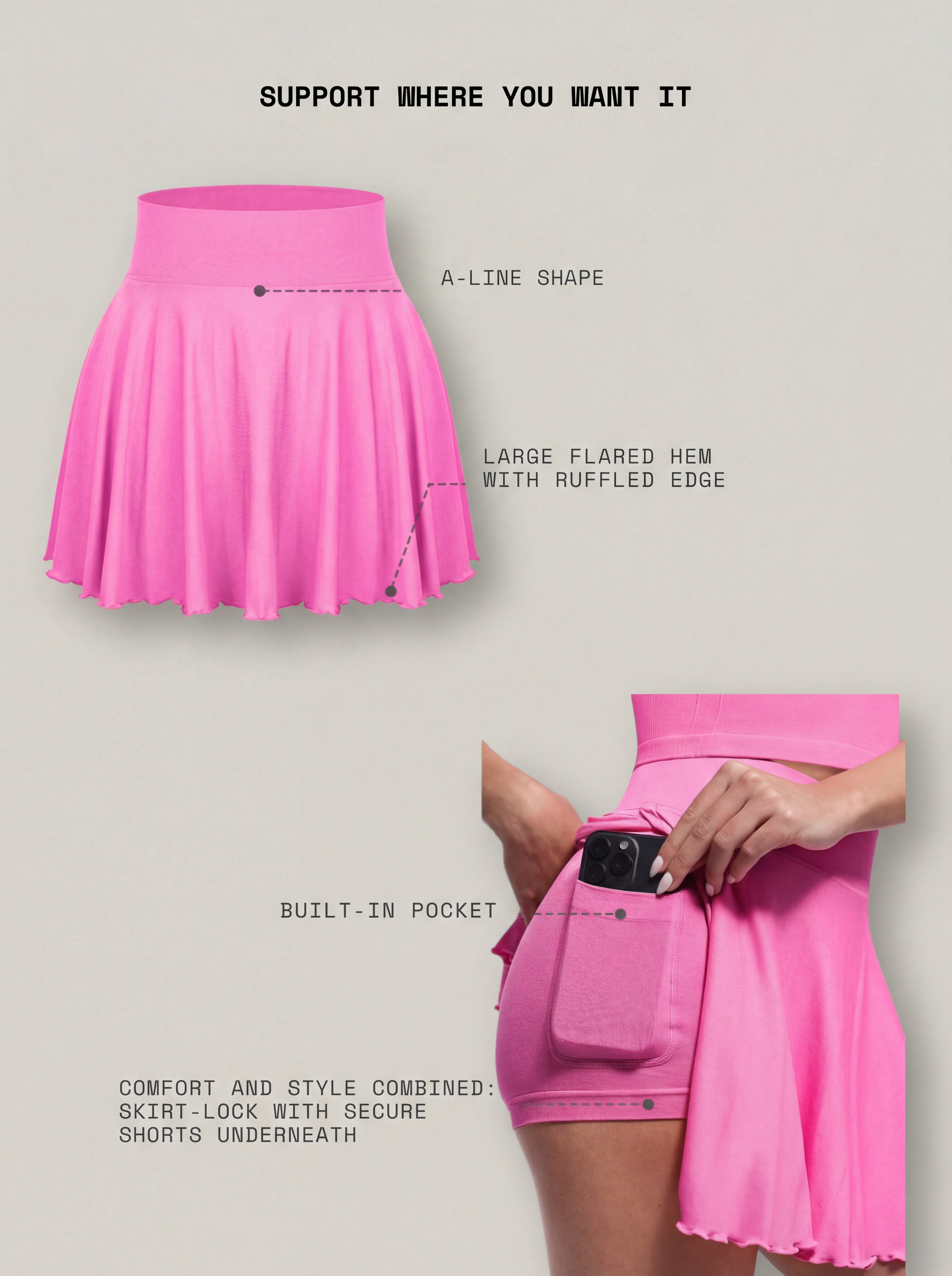 FlareSculpt™ Skirt blends feminine movement with built-in performance for a look that’s as flattering as it is functional. The mid-waist, double-layer waistband smooths and supports without rolling, while the A-line silhouette skims the body for an effortlessly slimming effect. Seamless construction and four-way stretch keep you comfortable through every serve, stride, and stretch. Finished with a flirty ruffle hem and discreet built-in shorts for confident, all-day wear.