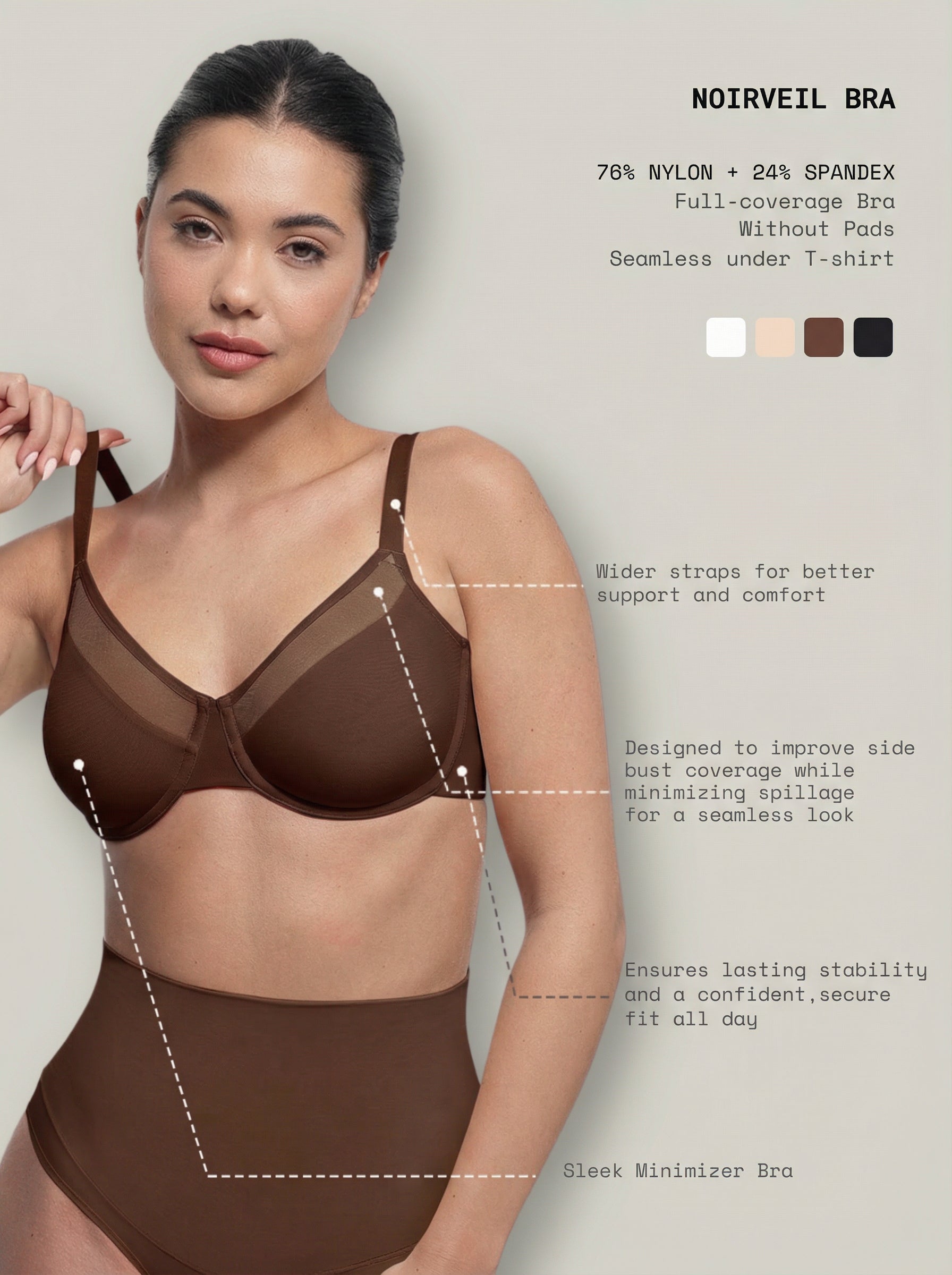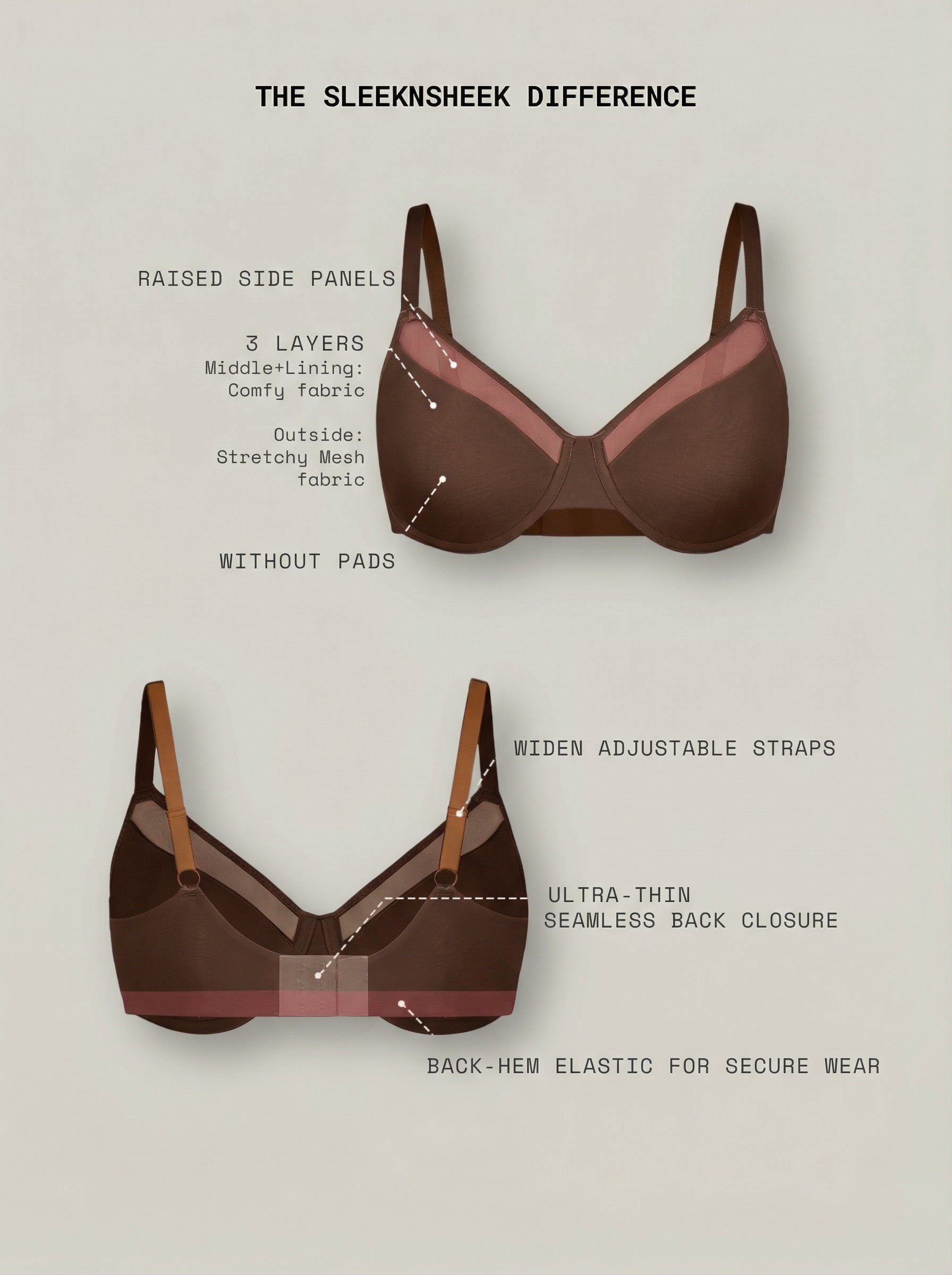 • Triple-layer mesh fabric enhances lift while maintaining a soft, skin-like feel