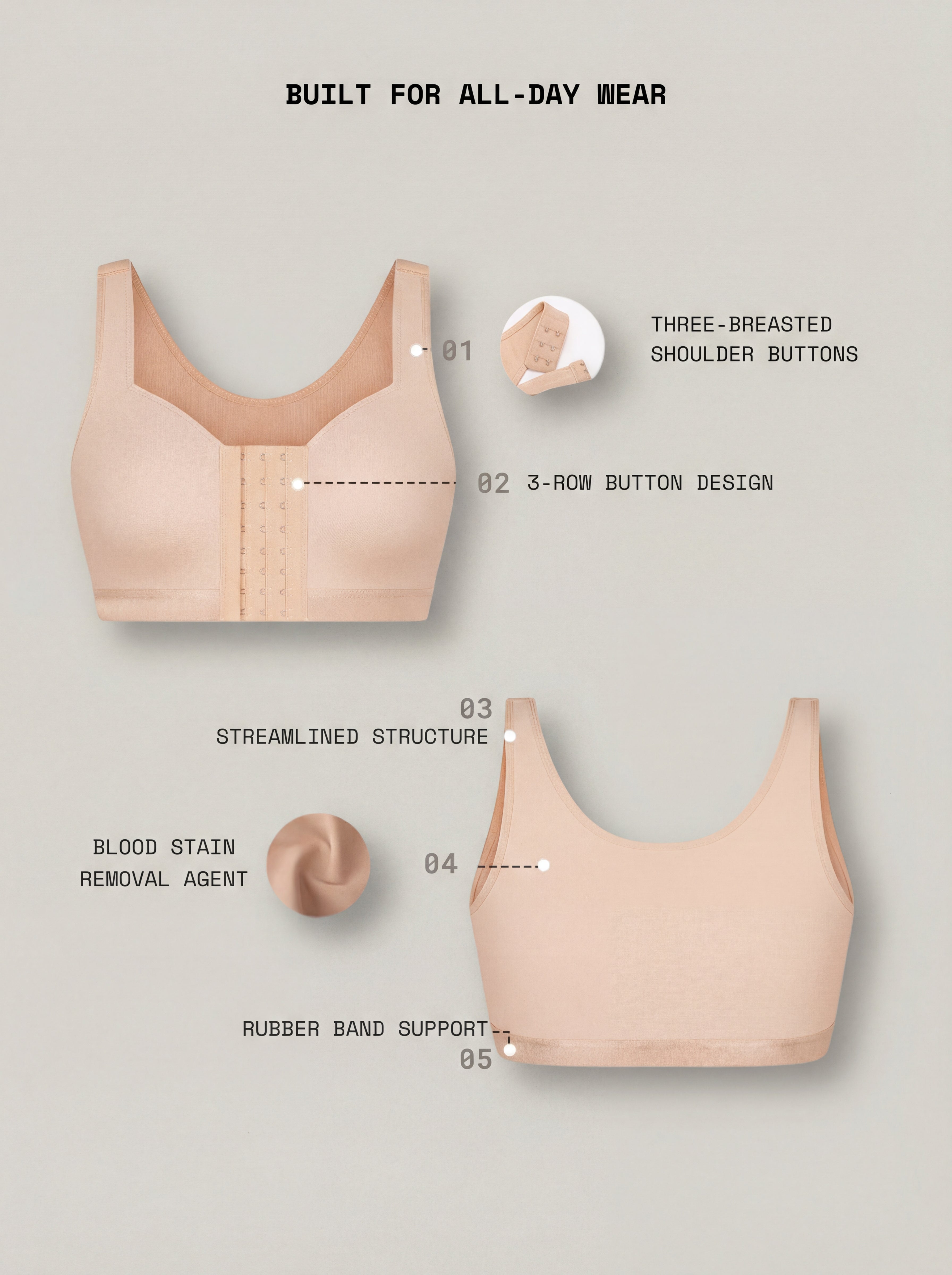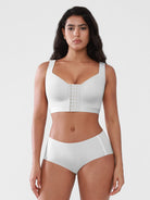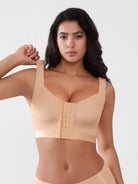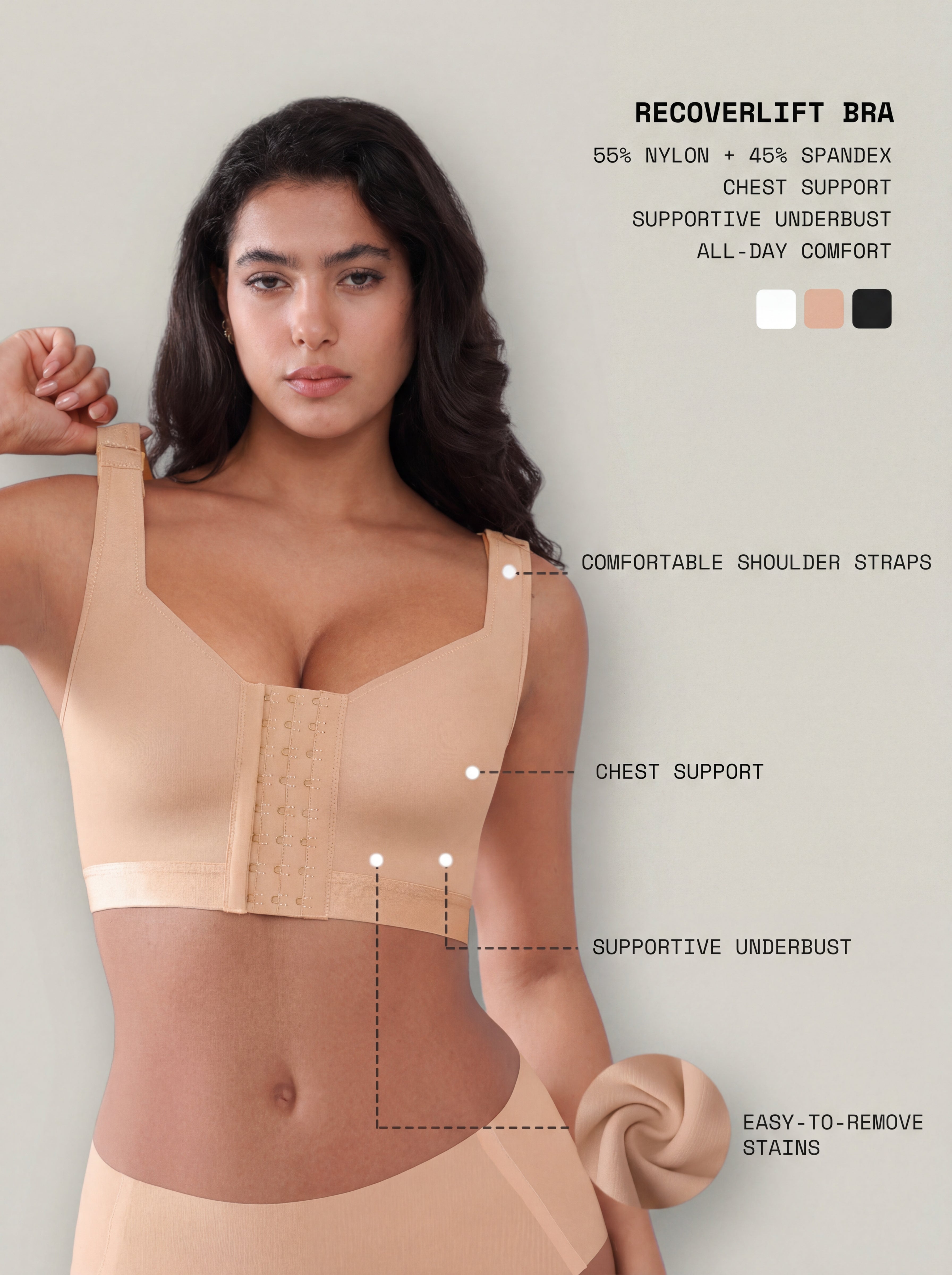Meet RecoverLift Bra, a premium post-surgery compression bra designed to support, shape, and stabilize with soft confidence during recovery. Its 3D molded cups and built-in support pads create a smooth, natural silhouette while delivering gentle lift without pressure. The front 3-row closure allows adjustable compression as your body heals, and the wide elastic hem keeps everything secure and supported. Finished with breathable, high-stretch fabric and minimal seams, RecoverLift Bra keeps you comfortable, protected, and beautifully supported all day.
