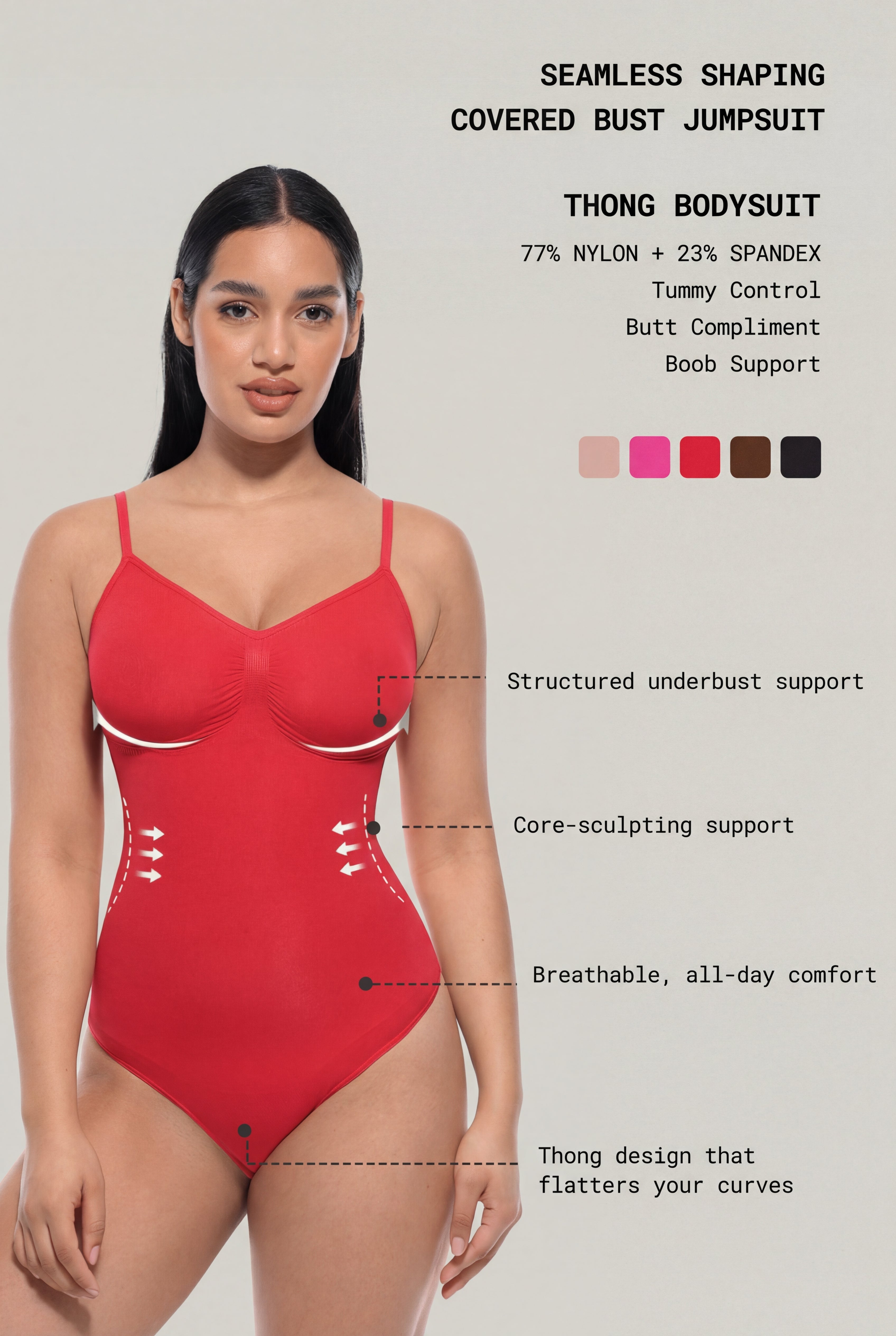 Smooth, breathable, and designed to sculpt without bulk, SculptSleek™ ThongSuit is a seamless covered-bust bodysuit that flattens the tummy, supports the bust, and enhances curves with a sleek, invisible finish. Made with lightweight NILIT® nylon fabric and high stretch compression, it smooths the midsection while staying soft and comfortable against the skin. The supportive underbust design offers gentle lift, while adjustable straps let you customize the fit for all-day confidence. Finished with a thong back to prevent VPL and a snap closure for easy bathroom access, it’s perfect under dresses, jeans, and fitted outfits.