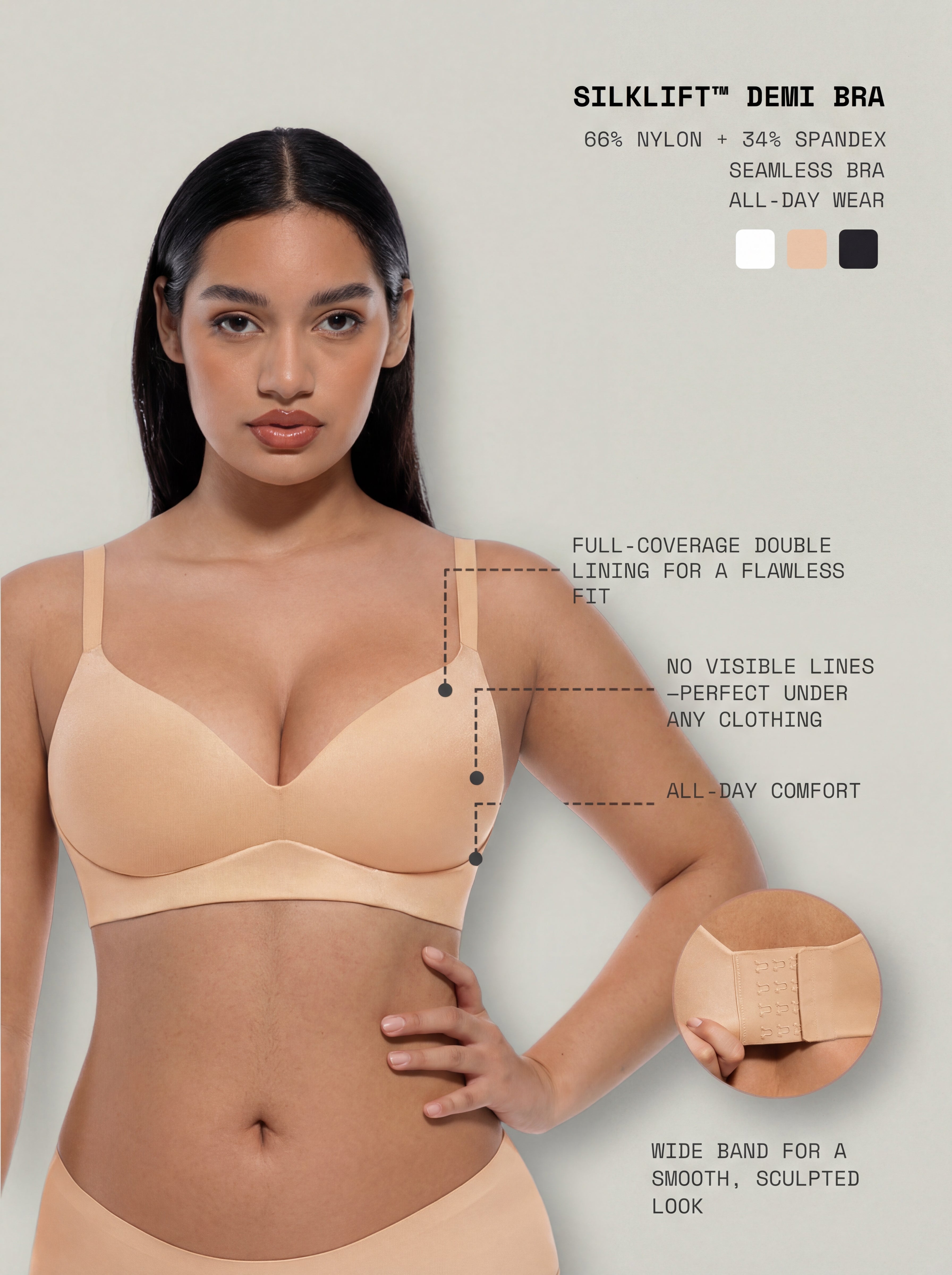Smooth, supportive, and irresistibly soft, SilkLift™ Demi Bra is designed to enhance your natural shape with effortless comfort. The wireless push-up design offers gentle lift and demi coverage for a flattering, everyday silhouette, while the seamless finish stays invisible under clothing. Crafted from buttery, high-stretch fabric with double-layered cups and a wide smoothing band, it delivers confident support without wires or bulk.