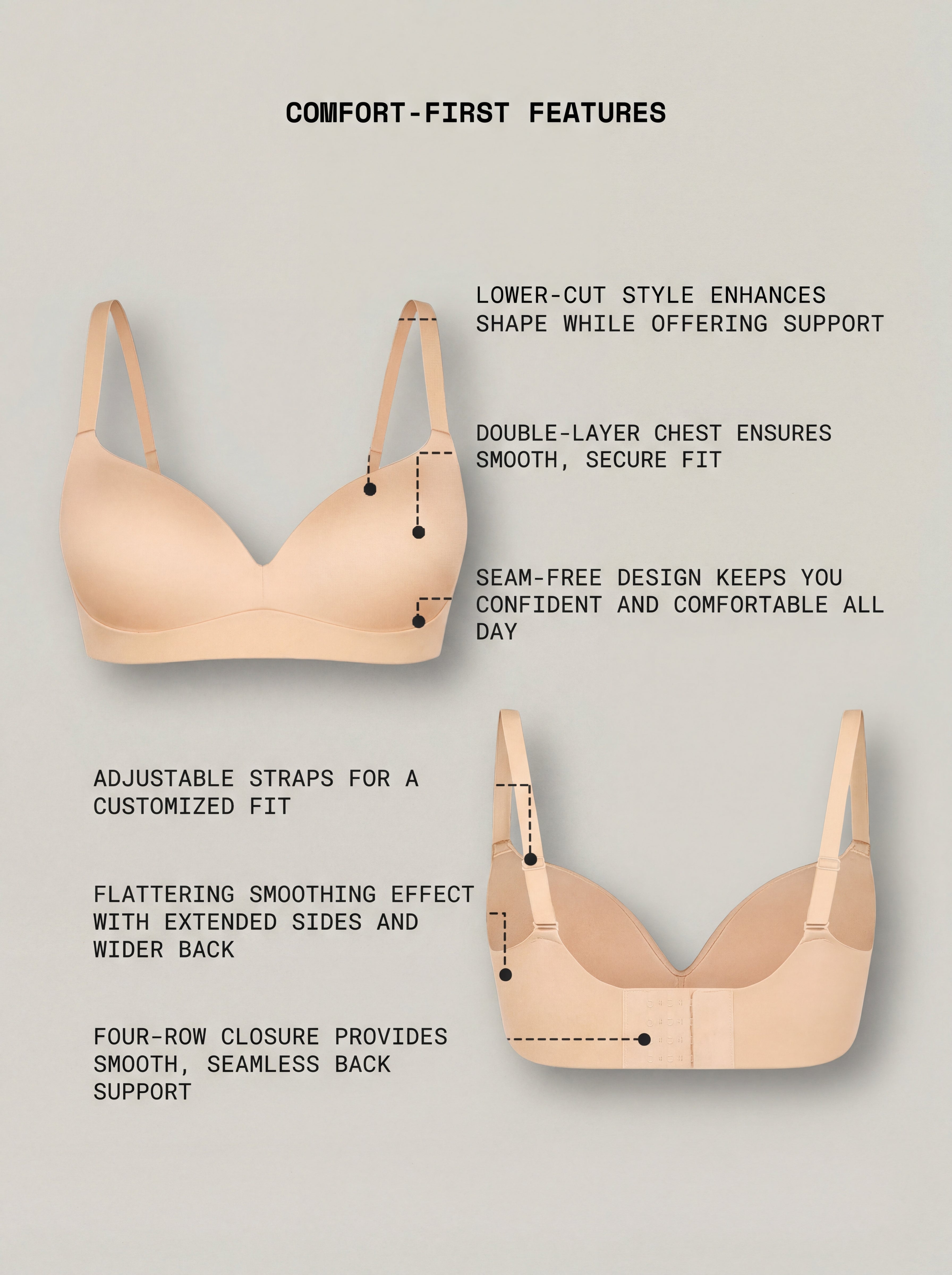 • Double-layer seamless cups ensure full coverage with zero transparency