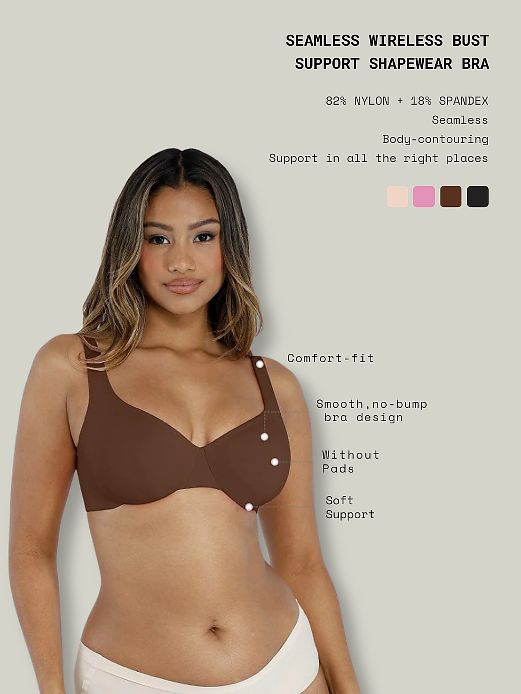 - Raised side support panels to gather and smooth side bust for a more centered silhouette