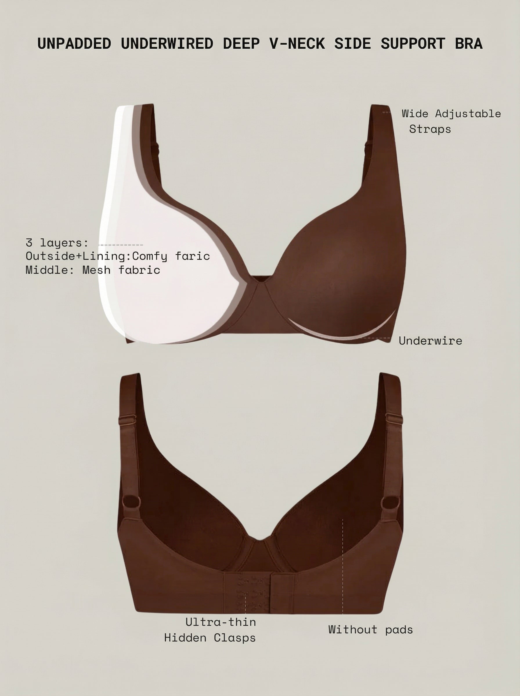 VelaLift™ Deep V Bra is the effortless, everyday essential that delivers smooth shaping and confident lift with a naturally flattering finish. Designed with a deep V neckline and unpadded cups, it enhances your shape without adding bulk while the underwire and side-support structure keep everything beautifully lifted and centered. Its seamless, body-contouring fabric disappears under clothing for a clean, polished look. Finished with widened adjustable straps and a secure, ultra-thin back closure, it’s comfort and support—elevated.